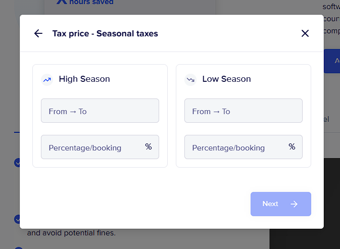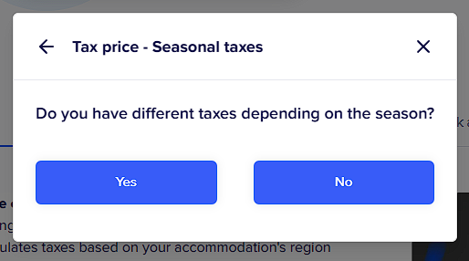 1 - Select if the taxes rate changes depending on the season follow by the option if you need to charge a percentage of the booking price or if you need to set the price manually.
