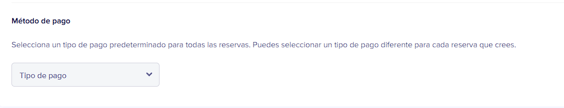 El tipo de pago es un dato requerido para todas las reservas enviadas a SES Hospedajes, este desplegable aquí se utiliza como valor por defecto para todas sus reservas con el fin de ahorrar tiempo eligiendo el método de pago más común.