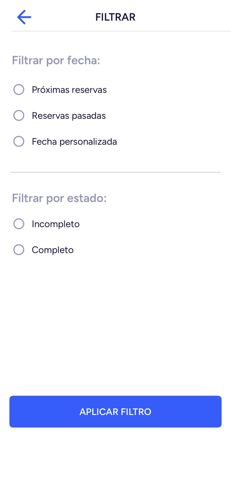 Después de haber creado la reserva, tendrás que buscarla en la aplicación para poder añadir los datos de tus huéspedes. Para hacer esto debes pulsar el botón "reservas" del menú. Arriba a la izquierda tendrás el botón para filtrar, abriéndose un nuevo menú que te permitirá seleccionar varios filtros.