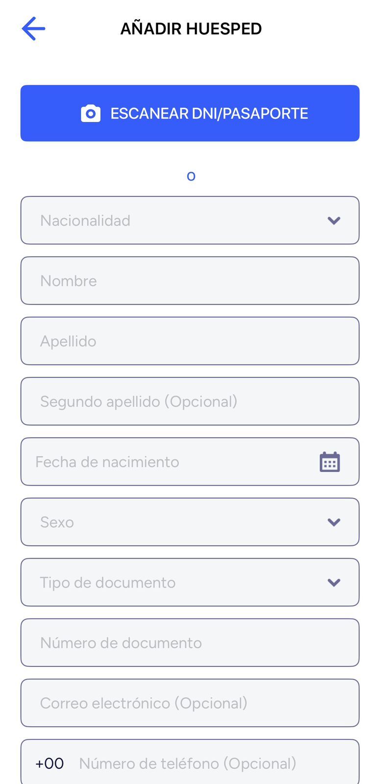 Para usar el escáner tendrás que pulsar el botón "Escanear DNI/Pasaporte", tal como se ve en la foto. Esto abrirá la cámara del teléfono que deberás enfocar al código MRZ del documento para que pueda detectarlo y importar los datos al formulario.