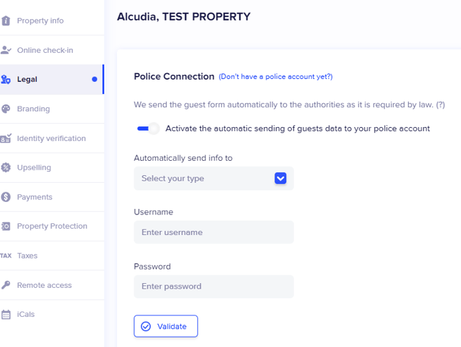 Las propiedades ubicadas en el Reino Unido y Francia pueden activar Chekin.com, pero no tendrán sincronización ni envío automático a la policía. Aun así, pueden usar Chekin.com para herramientas de check-in online, comunicaciones, generación y almacenamiento de documentos.
