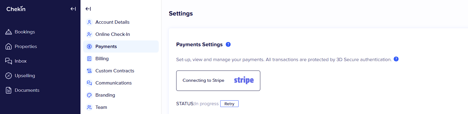 Conecta tu cuenta de Chekin a tu cuenta de Stripe. Si no tienes una cuenta de Stripe, tendrás que crearla. Puedes hacerlo desde el apartado "pagos" en la pestaña de ajustes. Stripe necesitará algo de tiempo para verificar tu cuenta.